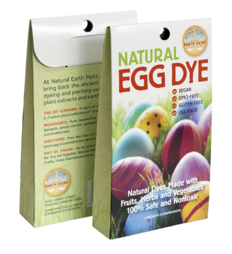 Age: Suitable for 3+ years. Directions: Pour the powdered dye into 1/2 cup of hot water and place egg in the dye for 10-20 min. Ingredients: Spinach extract, purple carrot extract, turmeric extract, beet extract, and red cabbage extract Safety & Quality: Made in the USA. Free of nuts, dairy, and gluten. GMO, animal product, and petroleum-free. Food-safe. Packaging: This kit is packaged in a 100% post-consumer recycled paper box with vegetable-based inks and home compostable pouches.